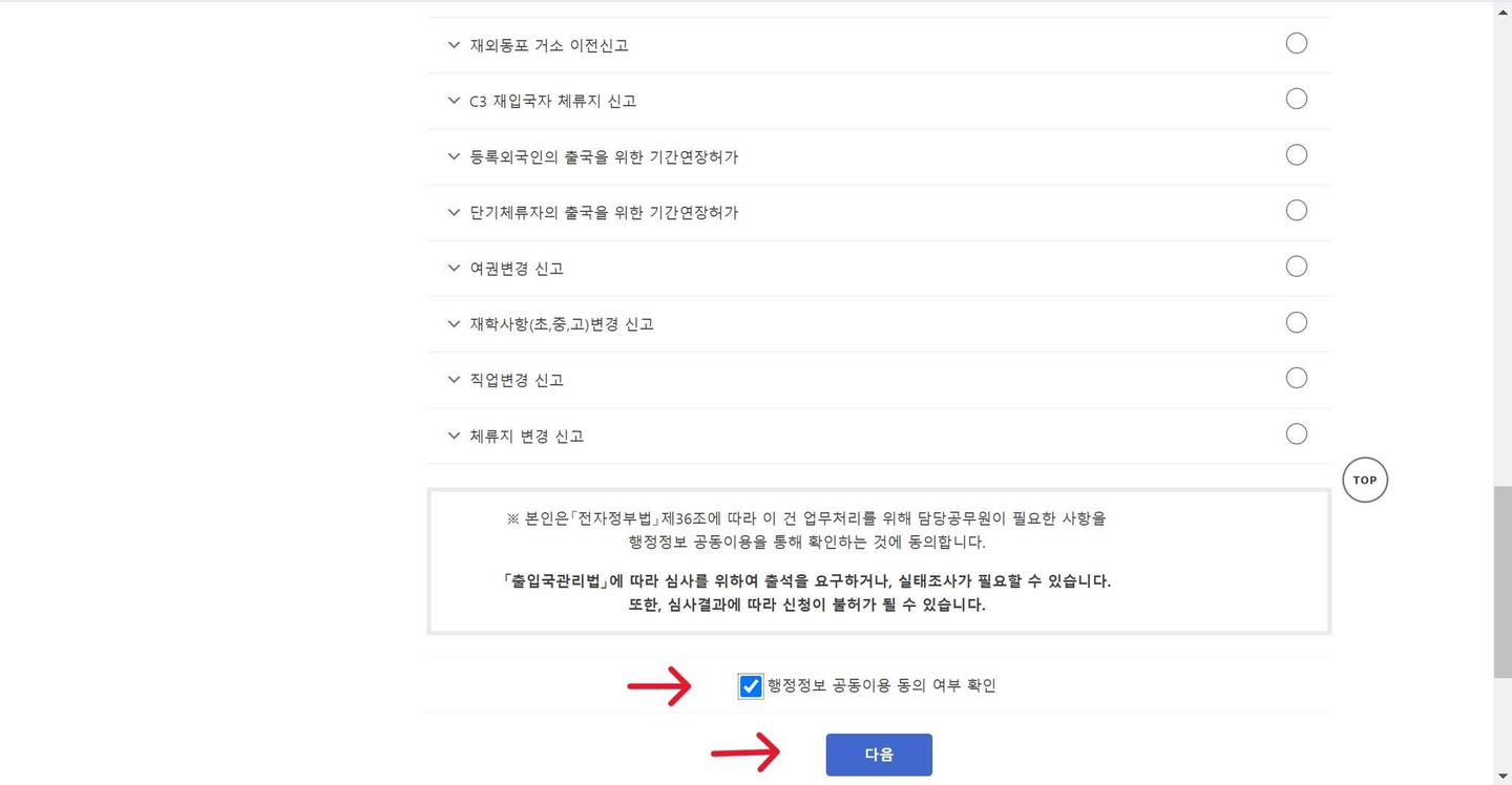 +Bước 3: Click vào ô 행정정보 공동이용 동의 여부 확인 rồi chọn 다음