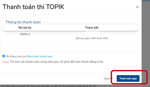 - Thí sinh cần thực hiện bước “Thanh toán ngay” trong vòng 30 phút. Nếu quá thời gian này, hệ thống sẽ không giữ chỗ và thí sinh sẽ phải thực hiện lại quá trình đăng ký thi từ đầu.