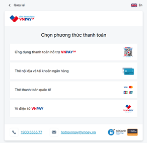 - Thí sinh vui lòng cân nhắc kỹ và lựa chọn một trong những phương thức thanh toán sau: thanh toán qua Quét mã QR/ Thẻ nội địa & tài khoản ngân hàng/ Thẻ thanh toán Quốc tế/ Ví điện tử VNPAY. Trong trường hợp thí sinh muốn thay đổi phương thức thanh toán so với phương thức đã chọn thì thí sinh sẽ phải thực hiện lại quá trình đăng ký thi từ đầu.