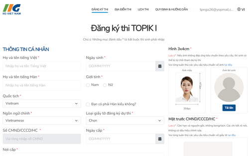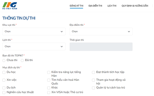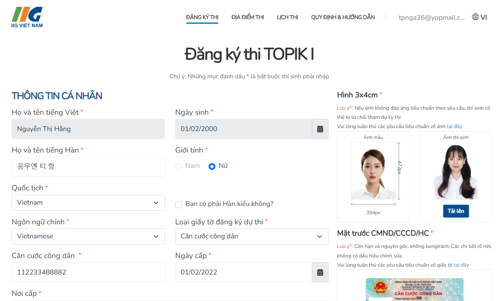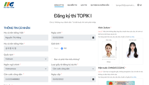 - Các thông tin cần cung cấp: Họ và tên (tiếng Việt), Họ và tên (tiếng Hàn), Ngày tháng năm sinh, số giấy tờ tùy thân (CCCD/ CMND/ HC), Địa chỉ liên hệ, Số điện thoại liên hệ, Email nhận thông tin, Thông tin dự thi (lựa chọn theo lịch thi được cung cấp trên hệ thống)