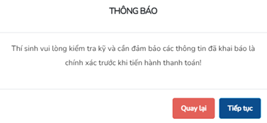 Trường hợp thí sinh đã khai báo thông tin hồ sơ chính xác, vui lòng chọn “Tiếp tục” để đến bước Thanh toán.