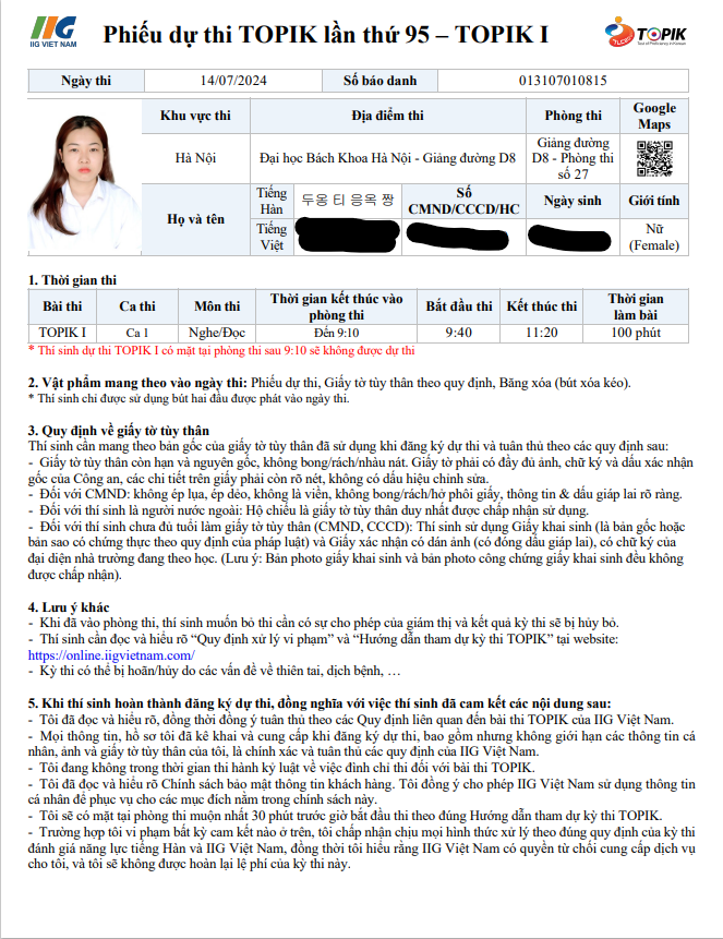 17. Thí sinh cần tuân thủ theo đúng quy tắc phòng thi và hướng dẫn của giám thị trong phòng thi. Đề thi năng lực tiếng Hàn (TOPIK) là sản phẩm mà Viện Giáo dục Quốc tế Quốc gia (NIIED) được công nhận bản quyền và pháp luật nghiêm cấm hành vi phát hành, sao chép hoặc lưu hành mà không có sự cho phép của chủ bản quyền. Các trường hợp cố tình vi phạm sẽ phải chịu trách nhiệm dân sự và hình sự, đồng thời bị cấm thi. Nếu thí sinh gian lận hoặc vi phạm Quy định kỳ thi, IIG Việt Nam sẽ xử lý theo Quy định xử lý vi phạm.