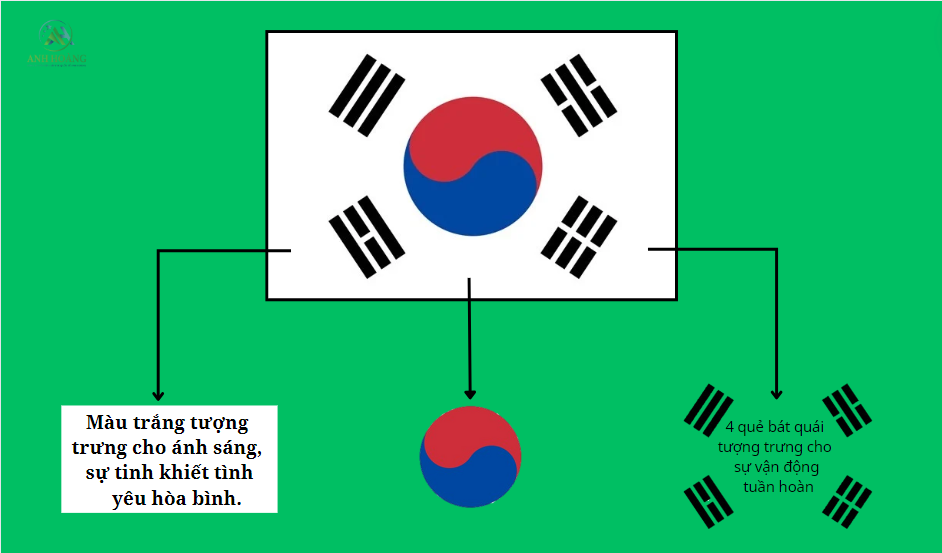 Màu trắng là màu nền của lá cờ nước Hàn Quốc. Màu trắng mang ý nghĩa ánh sáng, tượng trưng cho sự tinh khiết, tính đồng nhất và đồng thời thể hiện khát vọng luôn hướng tới hòa bình của người Hàn Quốc. Vì thế, người Hàn Quốc luôn hòa đồng trong mọi mối quan hệ để giữ vững hòa bình, thịnh vượng của đất nước, bao gồm cả các mối quan hệ ứng xử với các bạn du học Hàn Quốc. Bên cạnh đó, màu trắng còn là màu truyền thống, là biểu tượng của con người Hàn Quốc vì trong lịch sử, dân tộc Hàn có truyền thống mặc áo trắng và còn được gọi với tên gọi “dân tộc Bạch y”.